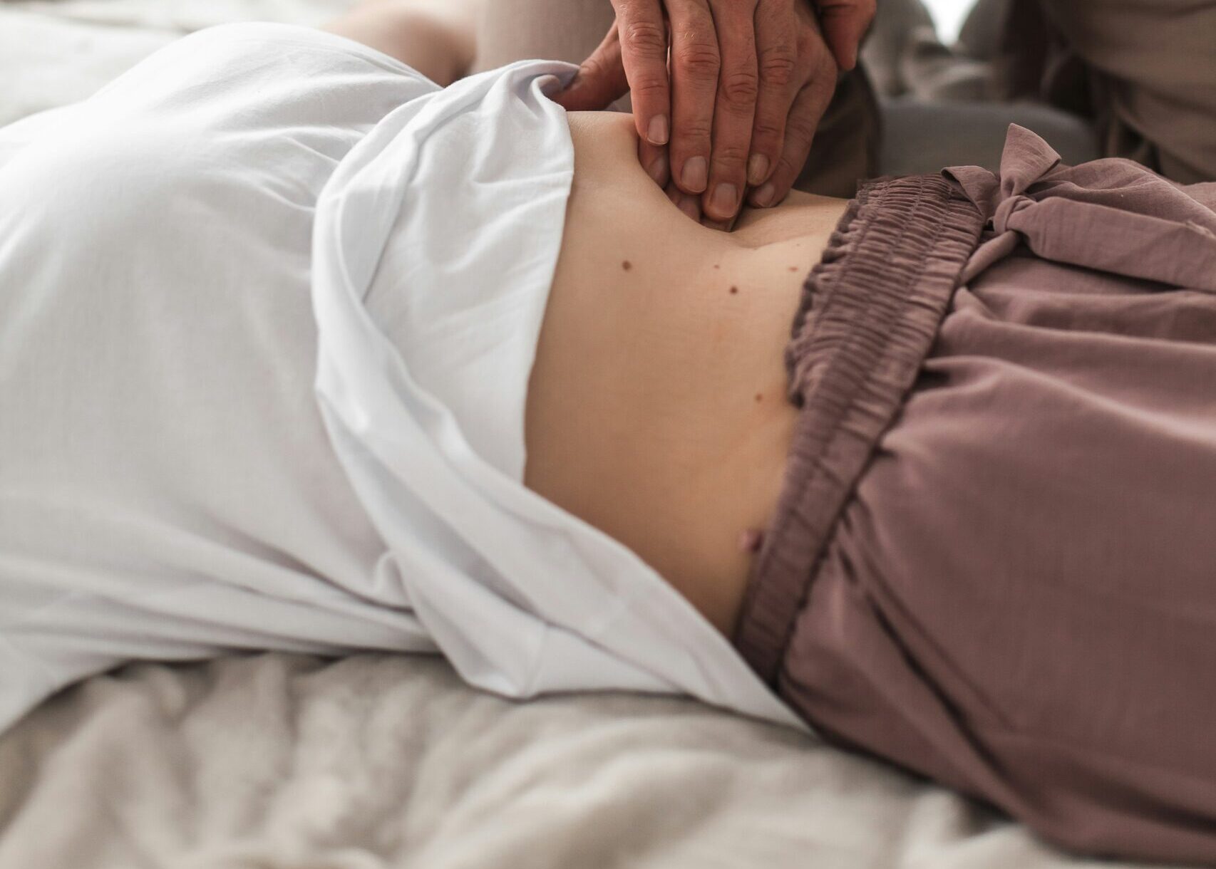 먼저 오른손 또는 양손을 아랫배(골반 위)에서 시작해서, 배꼽을 중심으로 넓게 시계 방향으로 20회 정도 원을 그리며 부드럽게 마사지합니다.